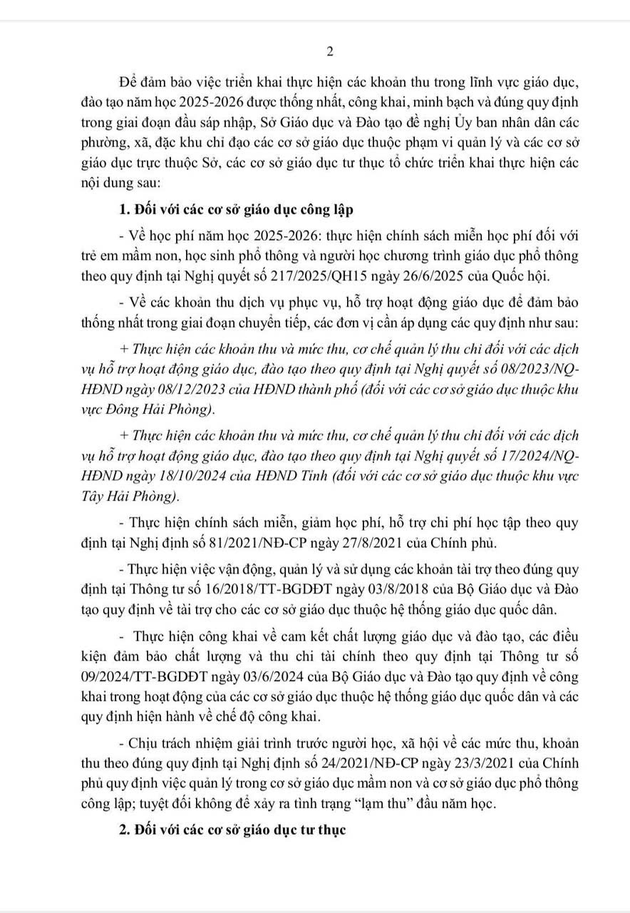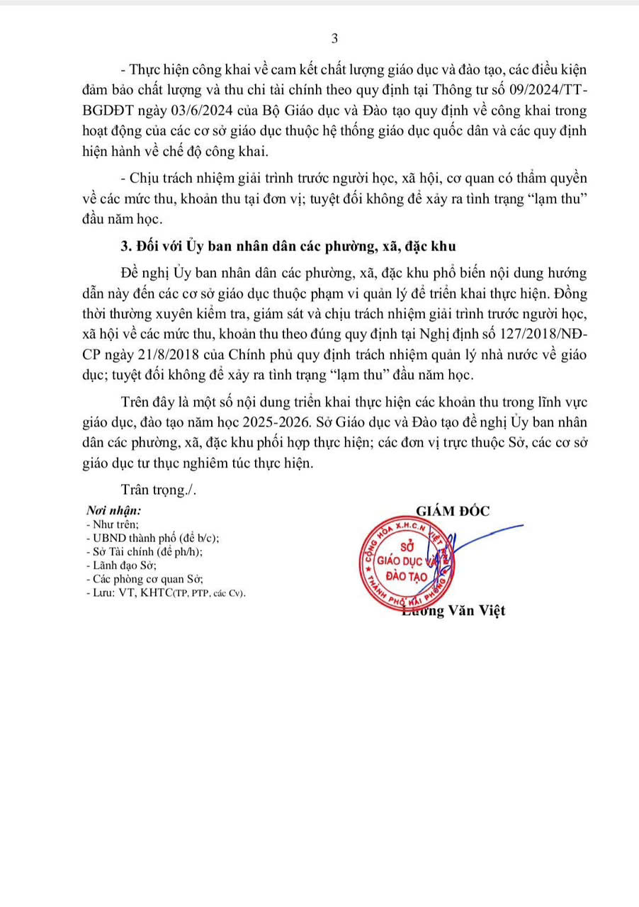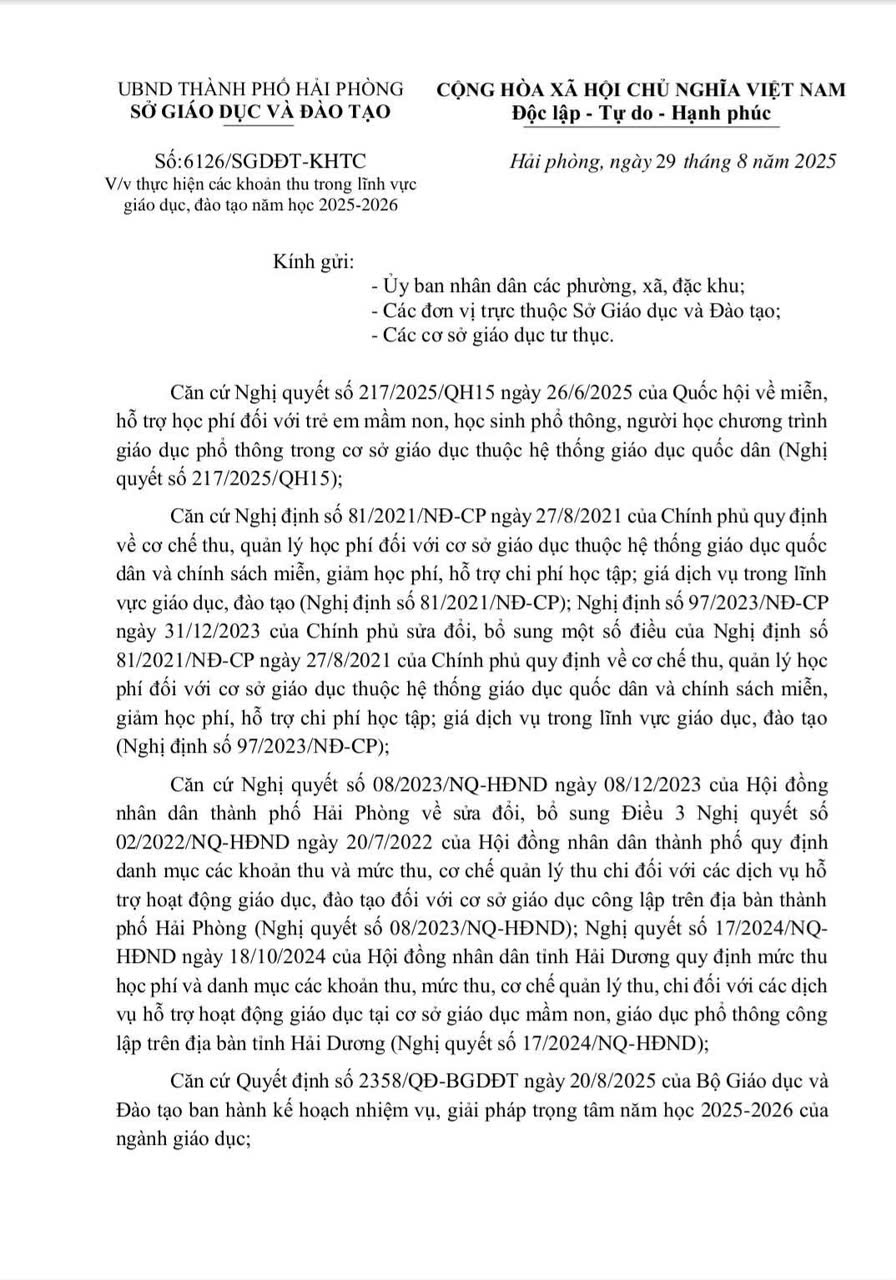 V/v thực hiện các khoản thu trong lĩnh vực giáo dục, đào tạo năm học 2025-2026